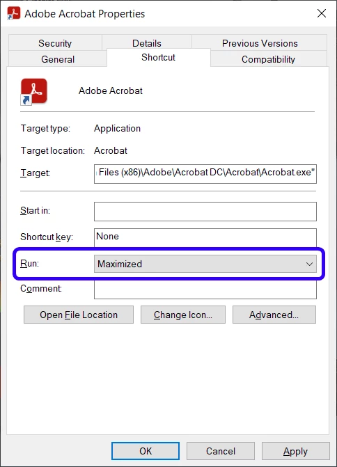 How do I get Acrobat to run in maximised window?