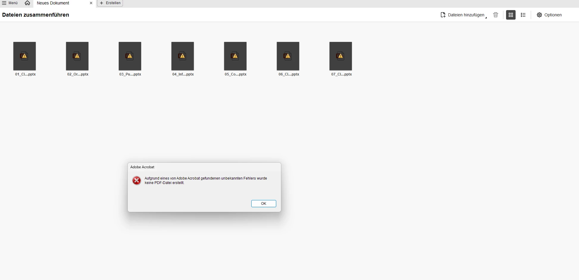 I want to merge several pptx files in Acrobat using the Merge tool in Acrobat. The tool opens, but does not display a preview of the pptx files. When I select Merge, the program starts but then closes with the message “No PDF file was created due to an unknown error found by Adobe Acrobat.” It works on another computer. Do you have any ideas?