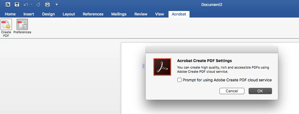We have a MacBook Pro running Highsierra that has Office 2016 that only gives us the options for Create PDF and Preferences on the ACROBAT ribbon in word 2016. When we click preferences it says this: