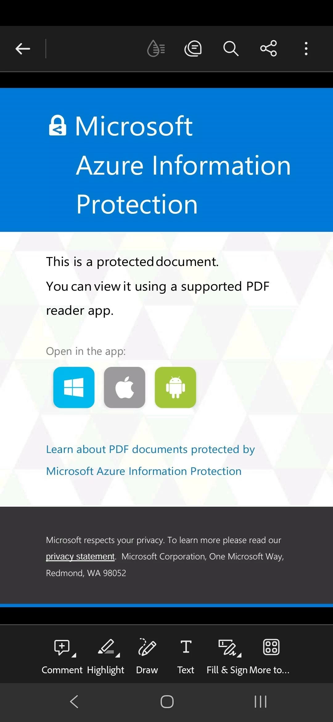 The Adobe Acrobat mobile app on Android (and iOS) does not currently support Microsoft Information Protection (MIP)-protected PDFs natively. This limitation is expected behavior at this time. While MIP-protected PDFs can be opened on Windows and macOS using Adobe Acrobat (with MIP plugin or native support), mobile platforms like Android and iOS do not yet support this functionality within the Acrobat Reader app.
