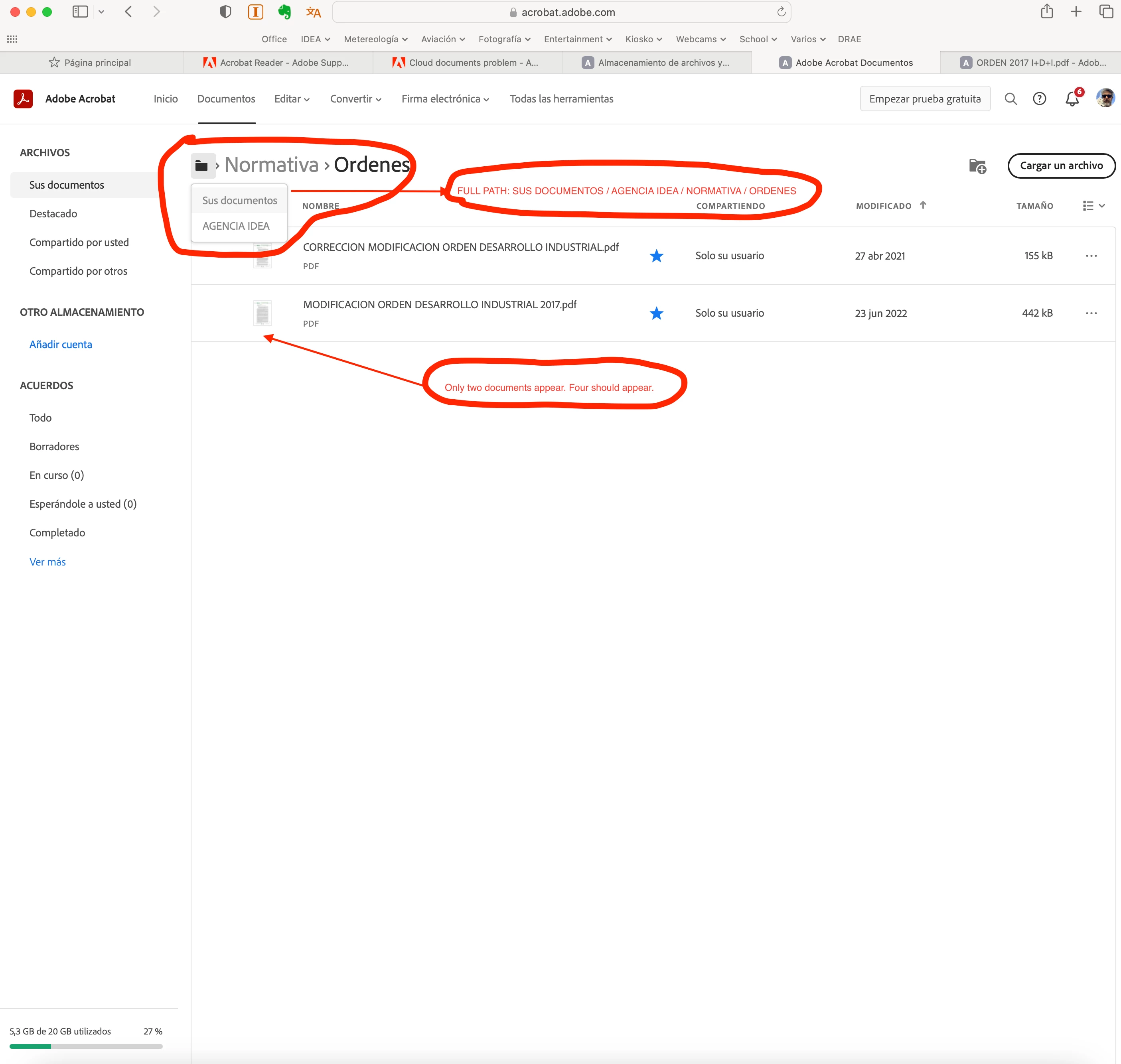 I will explain my problem again: When I go to the following path: misdocumentos/AgenciaIdea/Normativa/Ordenes only 2 documents appear, when there should be 4. Apparently the documents have disappeared. But when I do a search by file name, they do show up in the search result. When I click to open the document it opens normally and when I click to see the path where it is saved it appears correctly.