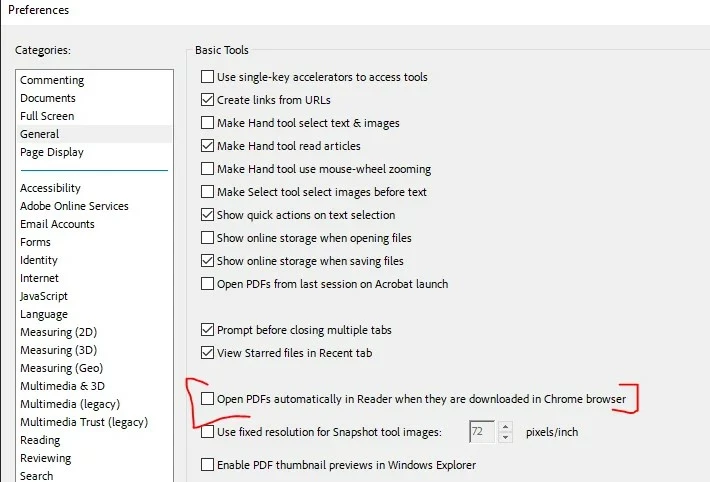 There seems to be a setting missing in Acrobat Pro that is present in Acrobat Reader. One of my users used to have their Adobe automatically open files after they downloaded them from a website we use. No, using adobe pro on a new computer, the process he was used to no longer works. Looking through the settings in Acrobat Reader vs Acrobat Pro there is a missing setting when using the pro version. the missing setting is in the screenshot Below