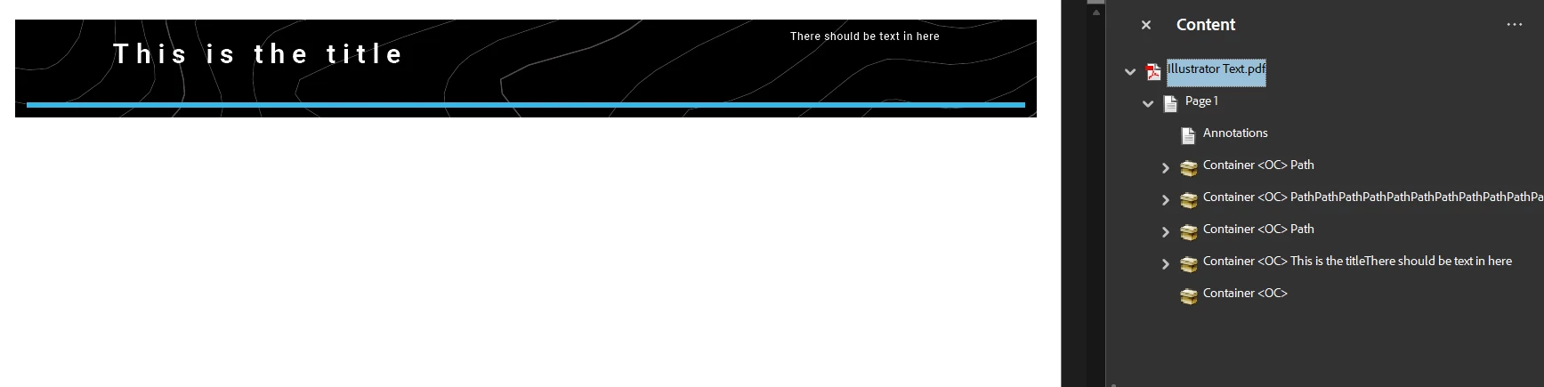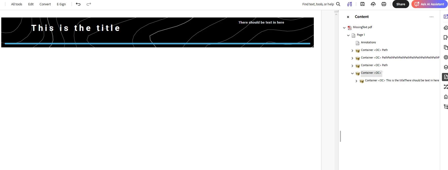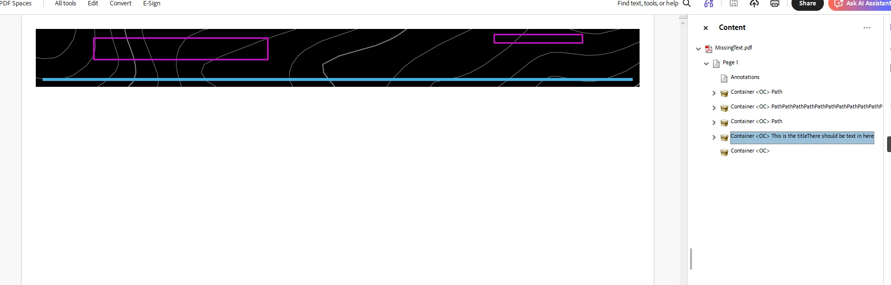When going to Edit mode for this PDF, the text are highlighted (so it knows it’s there, but just not displayed). Editing any of them by adding text, changing font color, etc. would cause the layers to appear. Undoing these changes and saving the PDF again fixes the issue but is not an ideal workaround.