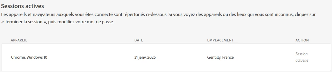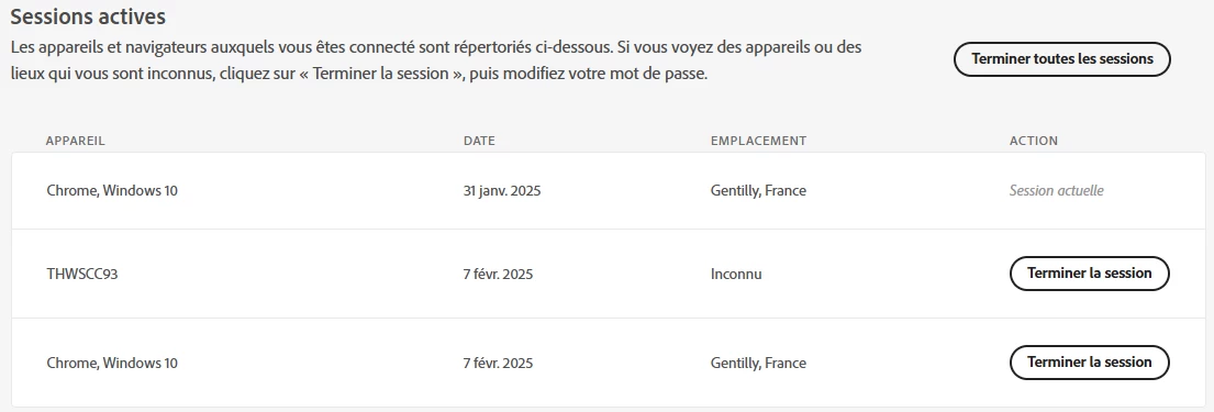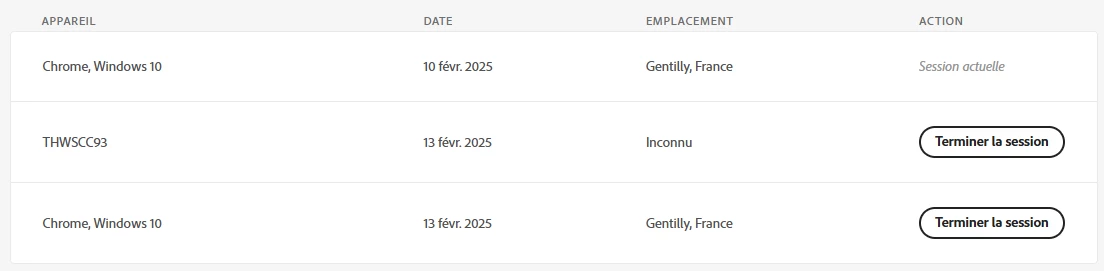 Sauriez-vous ce que sont ces 2 sessions "Chrome, Windows 10" ? Je n'ai pas de plugin Adobe sur mon navigateur Chrome, mon PC tourne sous Windows 11 et je ne suis pas sur Gentilly (mais pas très loin cependant).