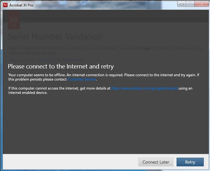 My Acrobat keeps asking me to validate but complaining that my computer is offline.