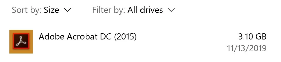 That figure of 15.6 GB provided by Windows' App & features absolutely does not reflect the amount of disk space used by Acrobat. This has been a known issue with Windows for many years. If you right-click on the folder at C:\Program Files (x86)\Adobe\Acrobat 2015 (or similar name depending on which version of Acrobat you are running), you will get the true size of the installation. It is generally less than 2.25 GB.