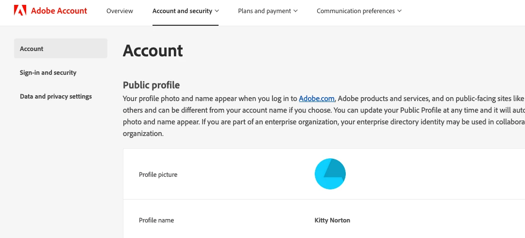 - Logged into my Adobe Account, the profile name is correct in both Profile Name and Account Name