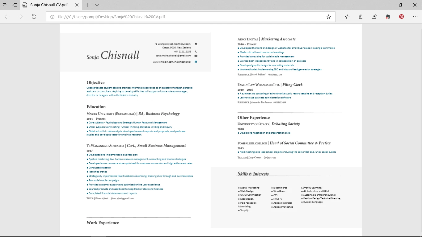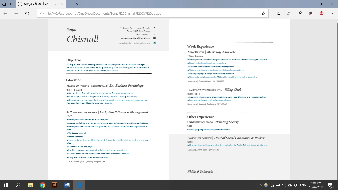 OR it ends up in two pages but with Work Experience on the first page when it looks like there could be room down the bottom for the text to shift down a bit so it fits on page 2 but this isn't working out as the skills then shift to a third page. Everything is how I want it on the word document though. Even when it converts there are extra white spaces at the top and bottom which is not visible to me on word that appears once I convert the document and I do not want those.
