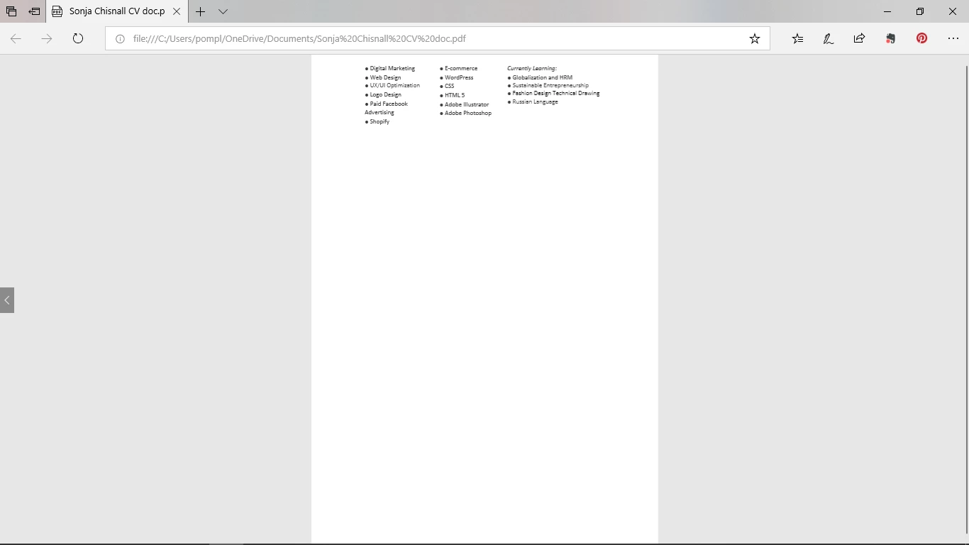 This is my two paged CV with the formatting that I want to convert into a pdf. The problem is the entire formatting changes when it converts but I want it to look exactly like this. I have tried printing to acrobat and I have tried changing print and other document settings including changing the doc from docx. to doc. but nothing seems to be working. It sounds like it should be a simple thing to do but this has been giving me a headache running around for answers. Please help.