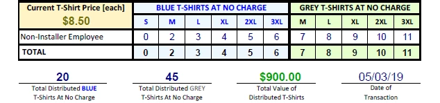 The TOTAL DISTRIBUTED BLUE T-SHIRTS field is calculated based off of the total combined quantities entered for sizes S, M, L, XL, 2XL and 3XL.