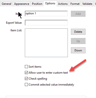 Hello I am creating a form with a dropdown list of options. I would like the user ALSO to be able to write their own text in the field, or edit the options. This was possible in a previous version of acrobat pro, and I have 20 forms I made in 2014 that used to have this option, but NO longer work. (user can only select an option, but can no longer type own text or edit the option selected). I see (in the properties) there is an option to allow user to write custom text, which I have ticked. But still doesn't work. anyone know why?