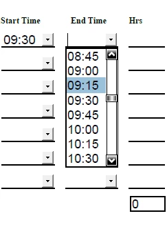 I'm trying to make a form for people to track their hours. My organization makes it be in 15 minute increments and it has to be in military time format. We currently have a drop down with every 15 minutes, and they have to add up their total time themselves.