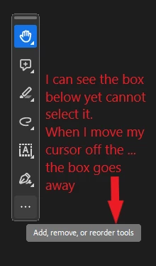 On the Quick Toolbar, if I hover over the '...' at the bottom, a flyout showing 'Add, Remove, or Reorder Tools' appears yet I cannot select it. Once I move off the '...', the flyout goes away.