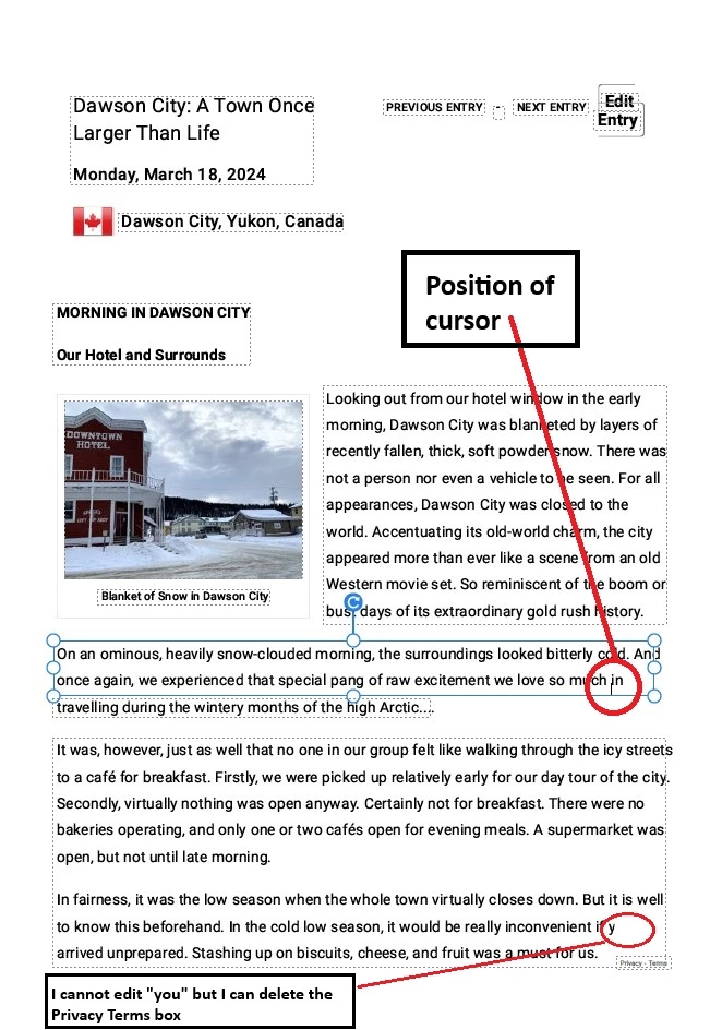 I convert my blogs, written on the TravelArk blog site, to PDF files to create blog books. To make my PDF files, I go into my published blog chapter, then Print, then Save as PDF. I usually have to tweak my ratios to enable pictures to fit and make the layout as good as possible. I have published ten books. Trying to tweak them is not always easy, but at least it has been possible.