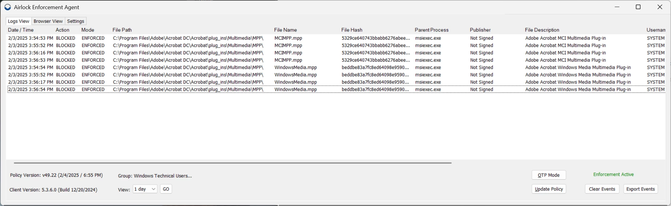 "2/3/2025 3:54:54 PM","BLOCKED","ENFORCED","C:\Program Files\Adobe\Acrobat DC\Acrobat\plug_ins\Multimedia\MPP\","WindowsMedia.mpp","beddbe83a7fc8ed64098e95902429de34e0acf4a17ceea85f30a0385110a79d1","msiexec.exe","Not Signed","Adobe Acrobat Windows Media Multimedia Plug-in","SYSTEM","ALD-757772","NT AUTHORITY","C:\Windows\System32","C:\Windows\System32","services.exe",""