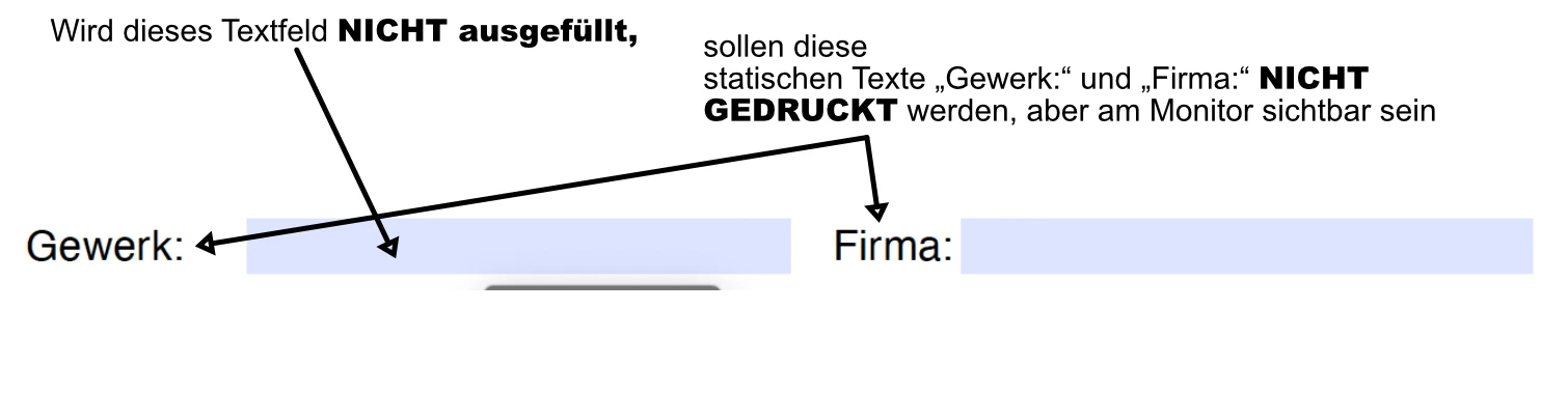 Wenn das Textfeld vom Anwender nicht ausgefüllt wird oder versehentlich eingegebener Inhalt wieder gelöscht wird, sollen zwei daneben stehende statische Texte nicht ausgedruckt werden, aber am Monitor sichtbar bleiben.