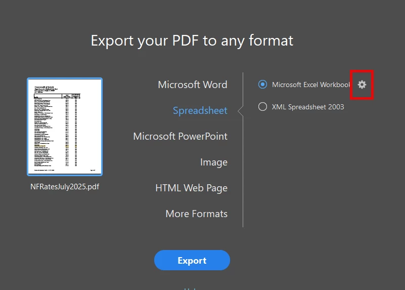 My desktop Adobe app has and 'settings' widget when converting a PDF to Word or Excel. Why is the same option not available on the web application? How do I add it to the web app version?