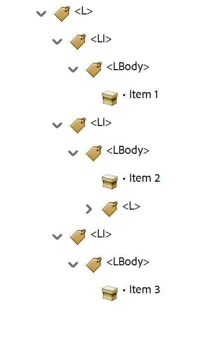 The PDF/UA standard has another "error" regarding the <Lbl> tag when tagging naked lists. These are lists that do not have a number, bullet, or other character on each <LI>, such as with a list of employees, a recipe's list of ingredients, etc. In these naked lists, there shouldn't be an <Lbl> tag, just an <LBody>.