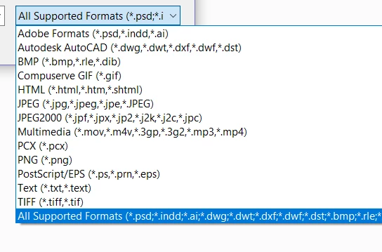 Create PDF, select file.  The only file types shown are Adobe formats, Autodesk, BMP, GIF, HTML, jpeg, multimedia, pcx, png, postscript, text, tiff.  See attached image