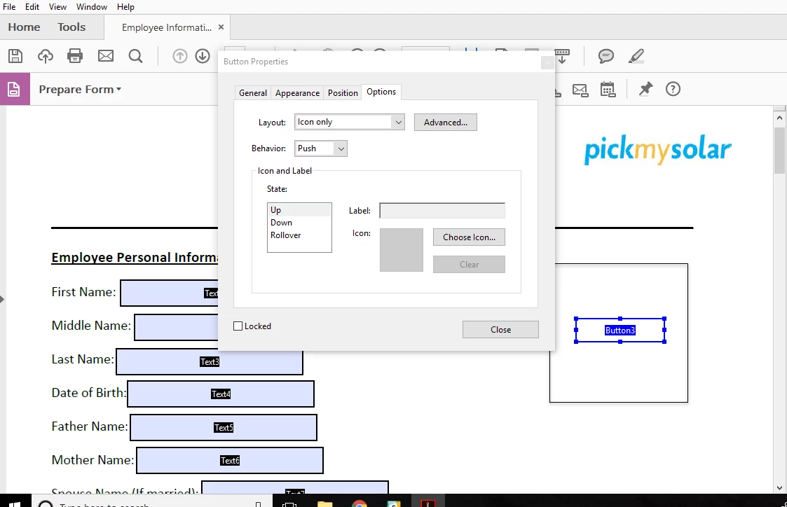 I am trying to add a button for Image upload in a PDF form. There is no option to add java script as no action tab exists in properties of the button.