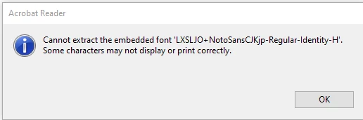 Using the Noto fonts for CJK glyphs, the PDF we create displays fine in PDF-XChange Editor but in Acrobat we get a warning dialog and then two of the lines don't display. File: ATE-3106.pdf