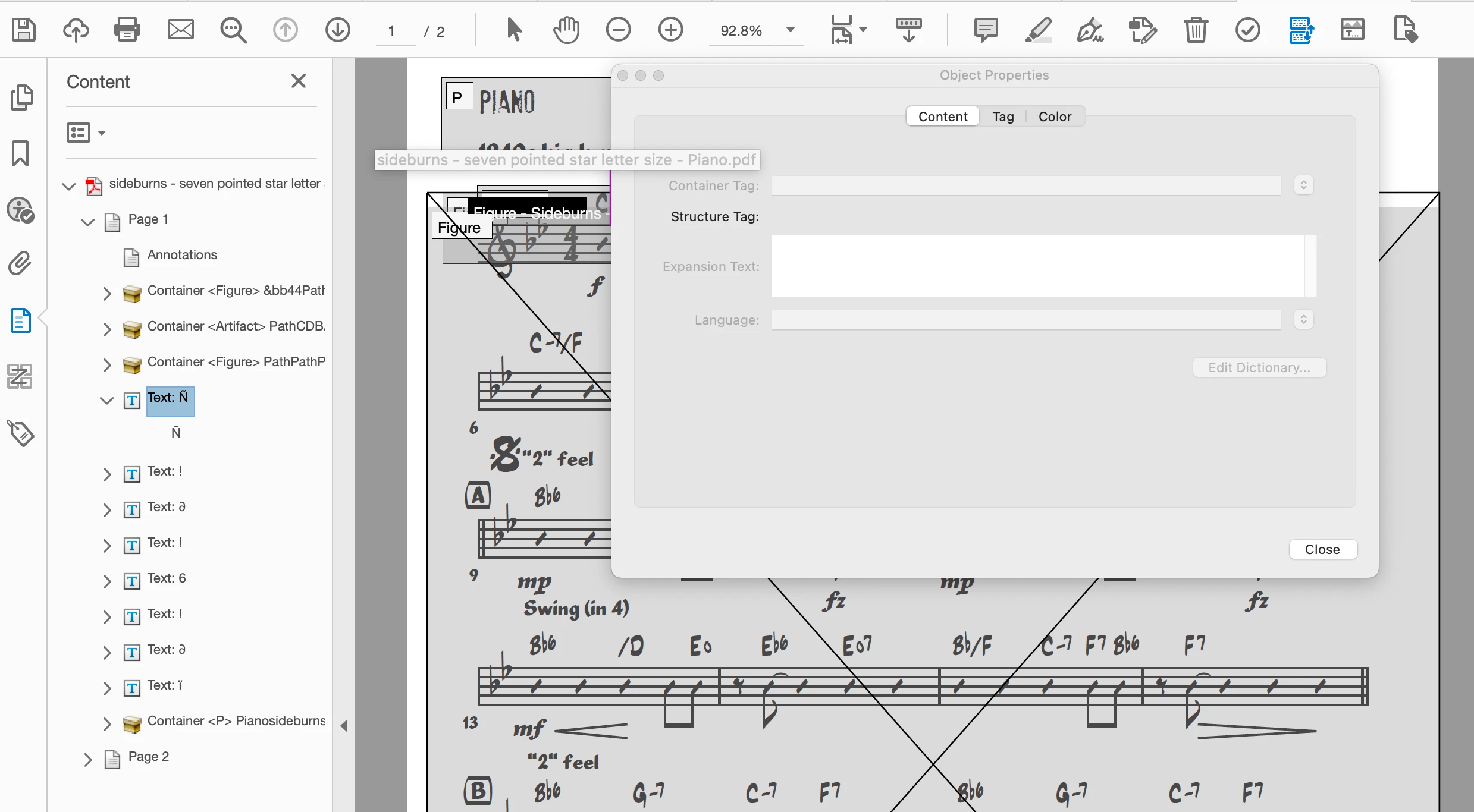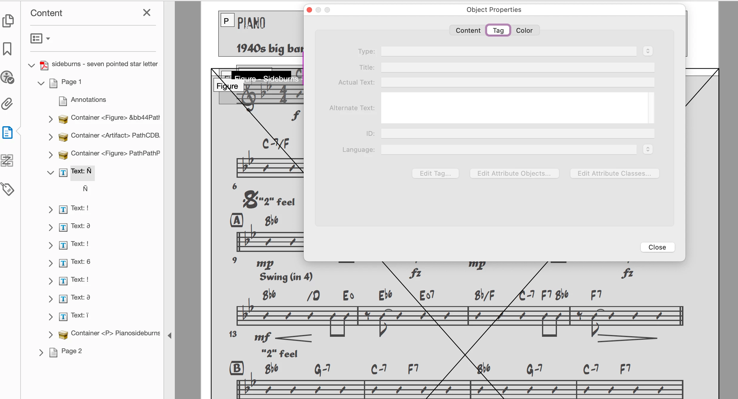When I run an accessibility check I get a lot of errors under "Tagged Content." The elements are always little bits of musical notation that Acrobat flags as text or paths.
