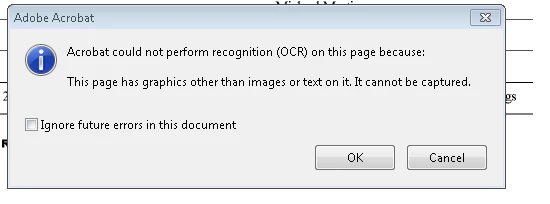 As the title states, OCR through Acrobat Pro DC gives errors when attempting to recognize text whilst the same document is recognized using OCR with Acrobat 9 Standard. This is not every PDF. There is a large number of PDFs that I'm having to resort to an older product. What's going on that would cause this problem? See the error messages below. This error is when using Windows 7 computers and repeatable on multiple machines.