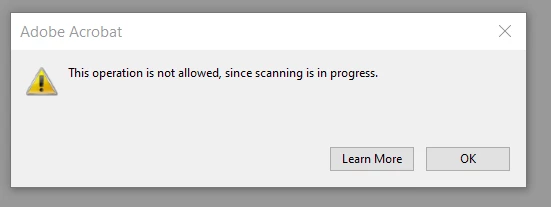 Furthermore, when I come to close Acrobat half an hour later it will not allow me to close Acrobat with the error message "This operation is not allowed, since scanning is in progress". Even though it said scanning was not permitted.