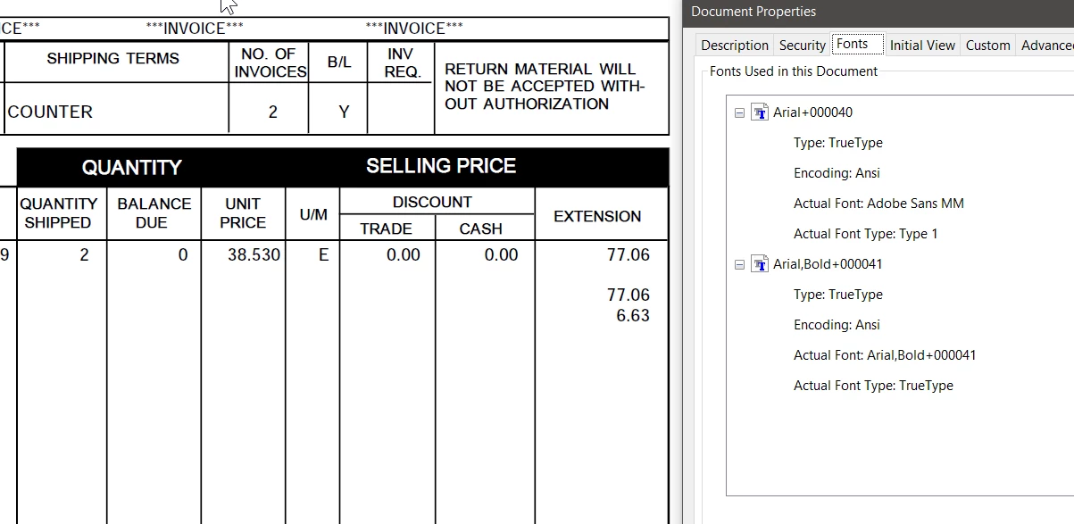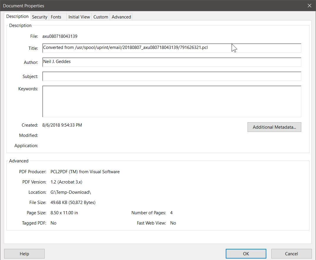 (4)     Looking at the Document Properties, this PDF file was apparently made by taking a PCL print stream from the billing application and creating PDF using a product called PCL2PDF which apparently produces somewhat problematic PDF based on what you received. Assuming that the billing software had no means of producing PDF itself, it would have been better to produce non-wonky PDF by producing PostScript and converting that to PDF via Acrobat Distiller (we also have server versions of such software) or printing to the Adobe PDF PostScript printer driver instance under Windows). Based on the title of the document shown below, I suspect that the invoice was produced either under MacOS or Linux.