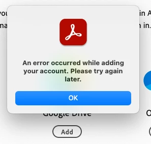 I have been able to connect my work OneDrive to Adobe Acrobat online (browser), but when I try to connect it to the desktop app on Mac, I am getting an error. (See screenshot below)