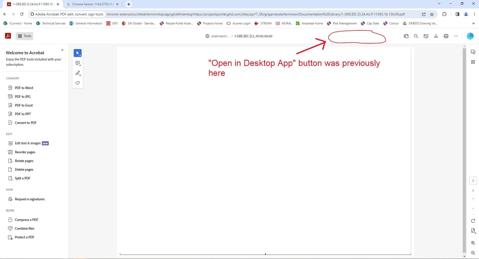 Since Thursday 15/06/2023 my Google Chrome Adobe Acrobate extension no longer has the button "Open in Desktop App" adn cannot find a way to have the document open from Chrome to Adobe Acrobat Pro as it previously did. This seems to coincide with the Google Chrome Version update 114.0.5735.134 which was released on Tuesday 13/06/2023.