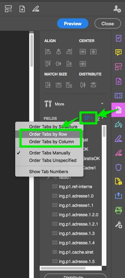 As per this post, I am trying to do the same, but have over 300 fields per page, and Acrobat does not organize them in any logical order. I've used the create multiple copies function a few times, and it has decided to randomly organize them as per the attached pic. I REALLY don't want to have to manually go through the list as it will only take one field at a time. Is there a way to pull a section together easily and then grab it as a whole and move it into the order of the overall sheet?