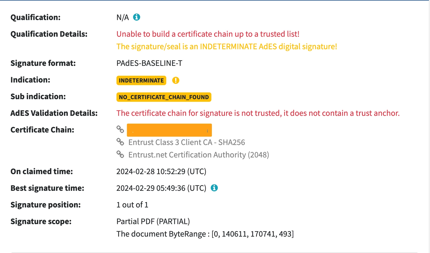 EU ETSI Validation Tool: Reports "NO_CERTIFICATE_CHAIN_FOUND" with details stating "Unable to build a certificate chain up to a trusted list" and "The certificate chain for signature is not trusted, it does not contain a trust anchor."
