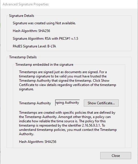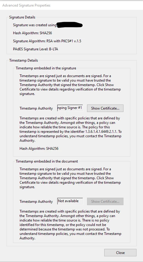 We are wondering why it appears, when we have seen other B-LTA signatures that do not have this panel (see further below). Also why does the Timestamp Authority show as "Not available". The actual signature is at Rev. 1 with the DocTimeStamp is at Rev. 2. The DocTimeStamp's CMS contains the certificate. My hunch that this is an embryonic step towards fully displaying the conforming attributes of B-LTA in one properties window? In which case does the second panel relate to the DocTimeStamp in Rev. 2?