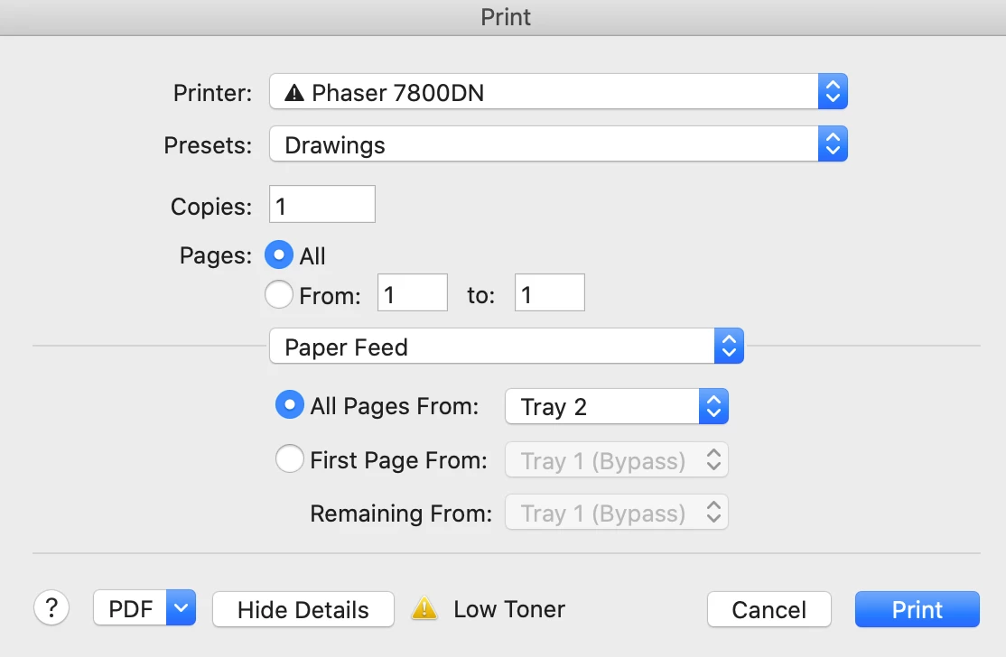 I am trying to print to a Xerox Phaser 7800. I am trying to print from Tray 2. I set the paper feed to Tray 2.