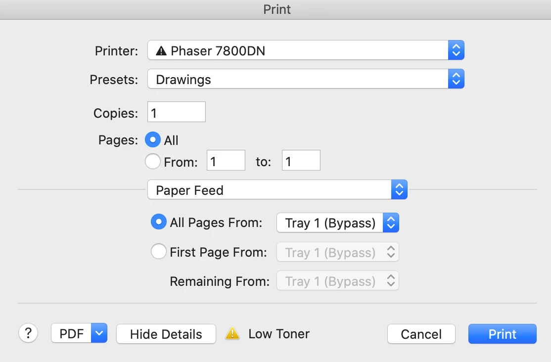 But then when I print, the printer says Paper not available in Tray 1. Every time, the printer dialog box defaults back to Tray 1 (Bypass).