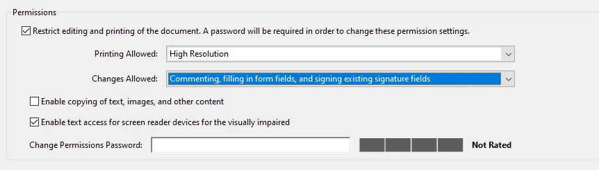 I did a whole bunch of testing today. Using an open-only password allowed me to view the form fields in Adobe, and the script reported all the fields I had put in. When I opened it outside of Adobe in Edge, there were no form fields to see. When I added editing permissions, Edge had no form fields viewable. I have the Adobe extension in Chrome, which seemed to work fine. When I deactivated the extension, Chrome opened it fine, using only the password to open it, not the password to make changes. Thankfully, it allowed the fields to be filled in and the document downloaded, which kept the setting requiring the password to open. I was hoping to enable anyone I sent it to open in whatever their favorite reader, fill it in, and return it. Do you think that may still be possible, or will my only recourse be Chrome and instructions on how to open, fill, save, and return it?