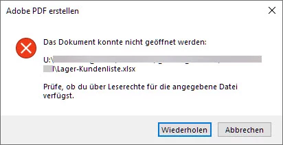 Hallo, ich habe unter Windows 10 Acrobat Pro aufgerufen, dort Erstellen > Einzelne Seite genutzt um eine XLSX-Datei in PDF zu konvertieren. Der Vorgang startet, bricht dann aber ab. In der Meldung erscheint der Hinweis, das möglicherweise keine Leseberechtigung vorliegt. Gleicher Vorgang mit XLS-Datei funktioniert. Habe neue XLSX-Dateien erstellt und auch verschiedene Speicherorte ausprobiert. Bei einer Bekannten, die auf einem anderen System arbeitet, das gleiche. Versuch, den Vorgang auf einem anderen Rechner (hier Microsoft Surface, Windows 11) durchzuführen, verlief erfolgreich, es wurden die selben XLSX-Dateien genutzt, die beim Windows 10-Rechner zu Problemen führten.