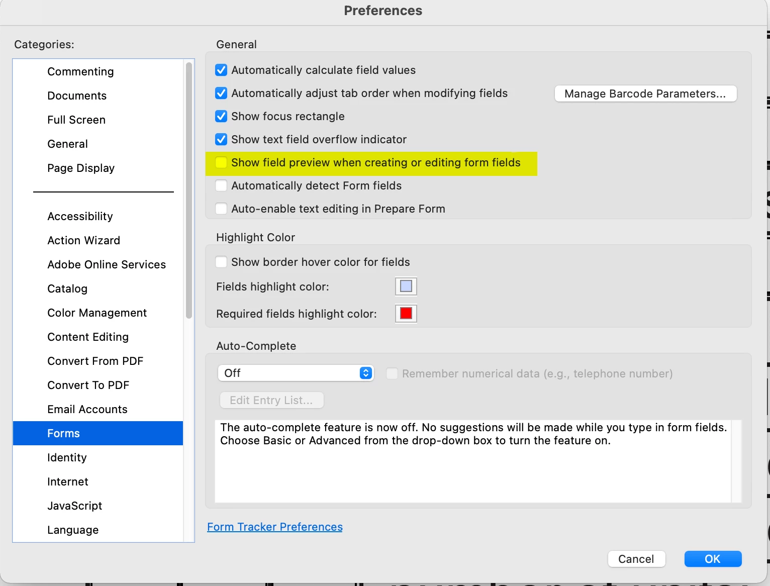 This does not solve the problem. If we're creating fillable forms that means we're probably sending them to people to fill them out. We shouldn't have to give instructions for people to adjust their settings to be able to use the forms. The forms should function properly on any computer without adjusting settings.