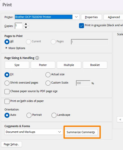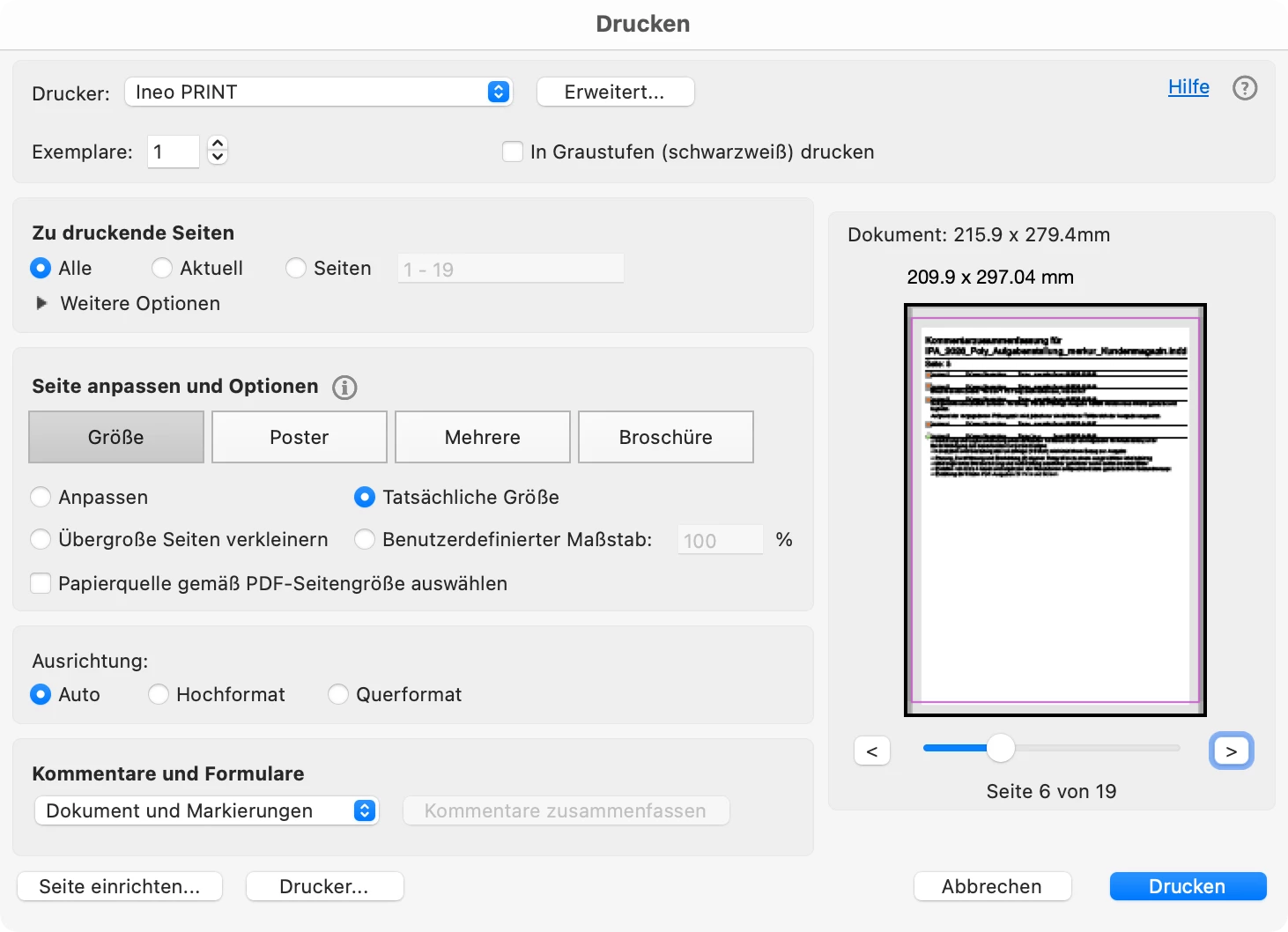 Ich möchte eine PDF-Datei mit Kommentaren so ausdrucken, dass auf der linken Seite des Ausdruckes die PDF-Seite abgebildet ist und rechts die Kommentare aufgelistet sind. Aktuell bekomme ich das nur so hin, dass die Kommentare auf einer separaten Seite (siehe Screenshot) aufgelistet sind. In Word gibt es eine ähnliche Funktion (siehe Screenshot). Vor einigen Jahren habe ich eine Tastenkombination dafür gekannt, diese habe ich leider vergessen… Wer hat eine Idee?