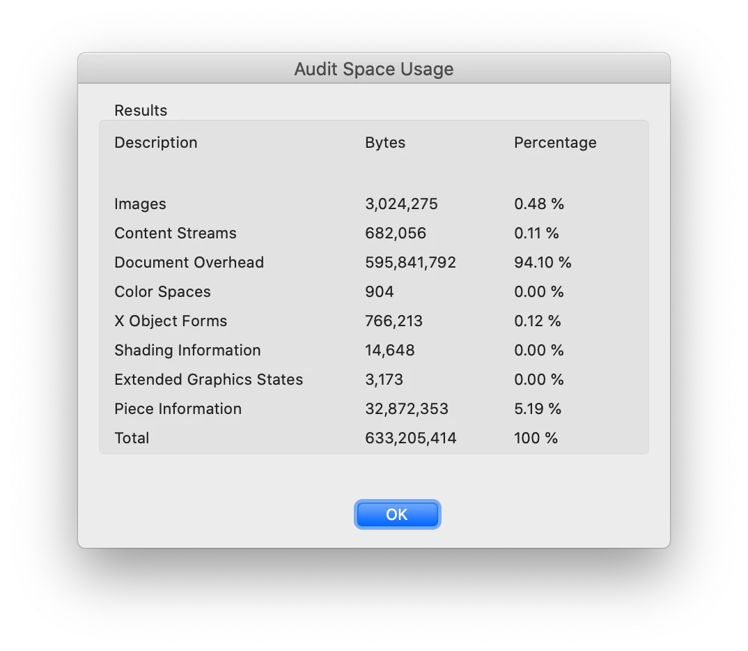 I'm trying to optimize a 700 MB PDF file with many embedded raster images. The image quality degrades, which is acceptable, but the file size isn't getting any smaller no matter what I do. I even lowered the compression setting to 20 dpi, which looks awful, yet the file size remains exactly the same after re-saving. Any ideas?