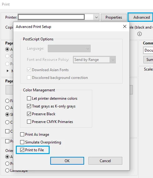 2- Select your printer from the drop-down option under Printer > click Advanced > uncheck the box next to Print to file.