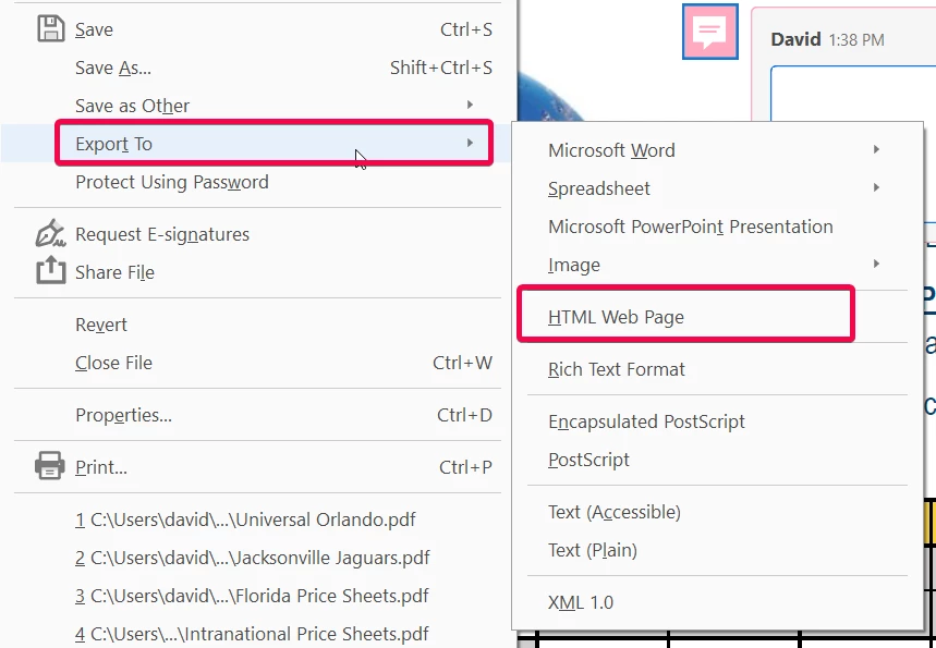 I found the steps to convert a PDF to HTML online, but when I use the website I am only able to export the PDF to a DOCX, PPTX, XLSX, or JPG. Is there another way to export this?