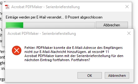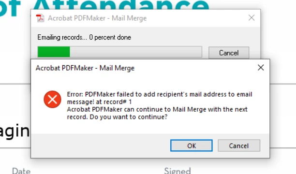 My colleague can go through a Word mail merge process and then go to Merge to Adobe PDF to create the PDF and mail them to the recipients based off an email address in the merge data set. At this point we get an error pop up as below: