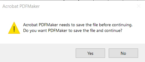 I am trying to create a PDF in MS Excel 365 (using Windows 10), but I get a popup box stating PDFMaker needs to save the file before continuing.