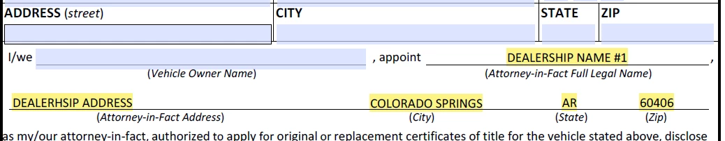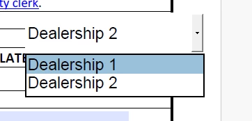 ex: *chooses dealership 1 from dropdown list* - name and address of dealership one populates in fields highlighted in yellow in photo 1.