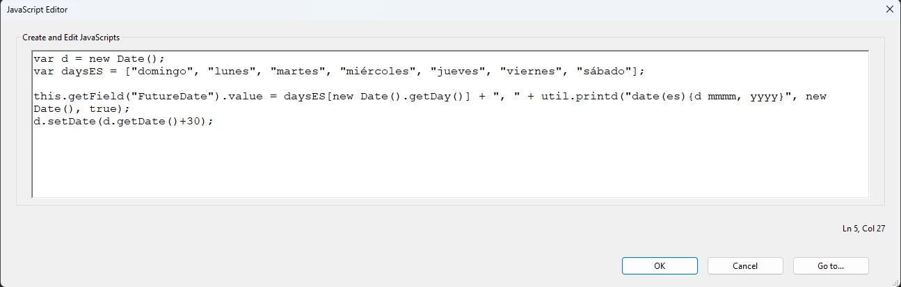 Thanks to this lovely community, I have a document that automatically predicts and populates a date in the future. Now it's time to translate that into Spanish, and I've run into some hiccups.