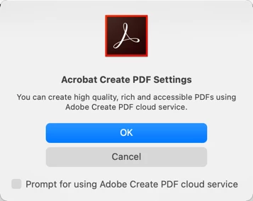 3. Menu > Acrobat > Create .pdf > (I get a "Acrobat Create PDF Window which reads You can create high quality, rich and accessible PDFs using Adobe Create PDF cloud service. Click Yes to create a rich PDF using this Service. Click NO to create a PDF without this service.)