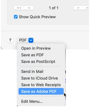 Even from the Print window, always go all the way down to "Save as Adobe PDF…"