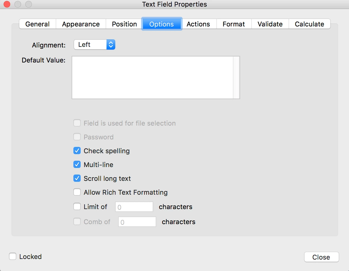 I recently created a document in Adobe Acrobat that has editable text fields. A screen shot of my Options properties is below.
